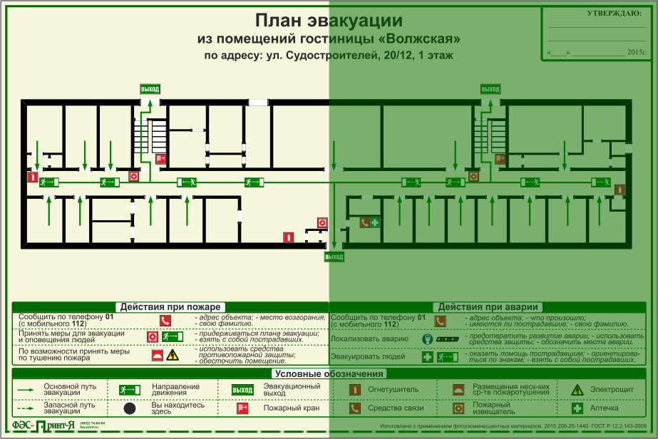 Размеры планов эвакуации выбирают в зависимости от его назначения, площади помещения, количества эвакуационных и аварийных выходов.